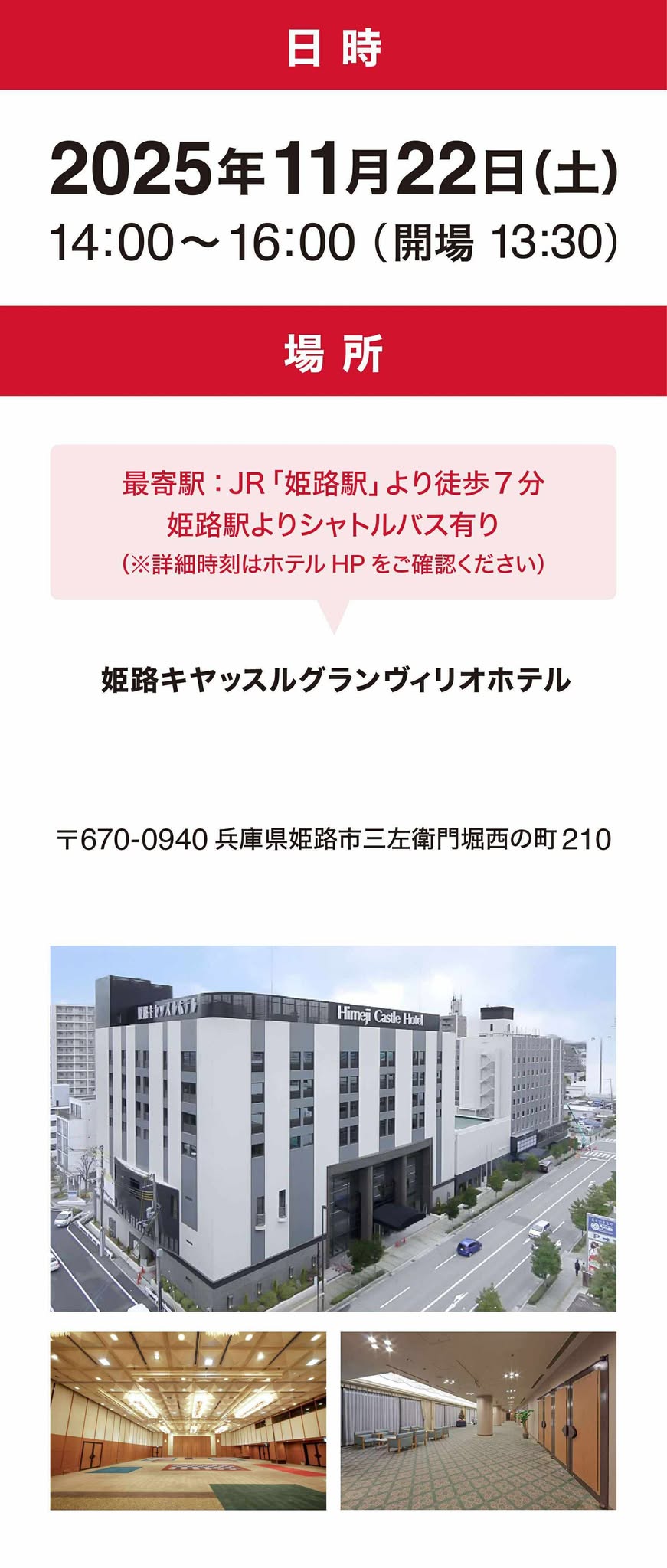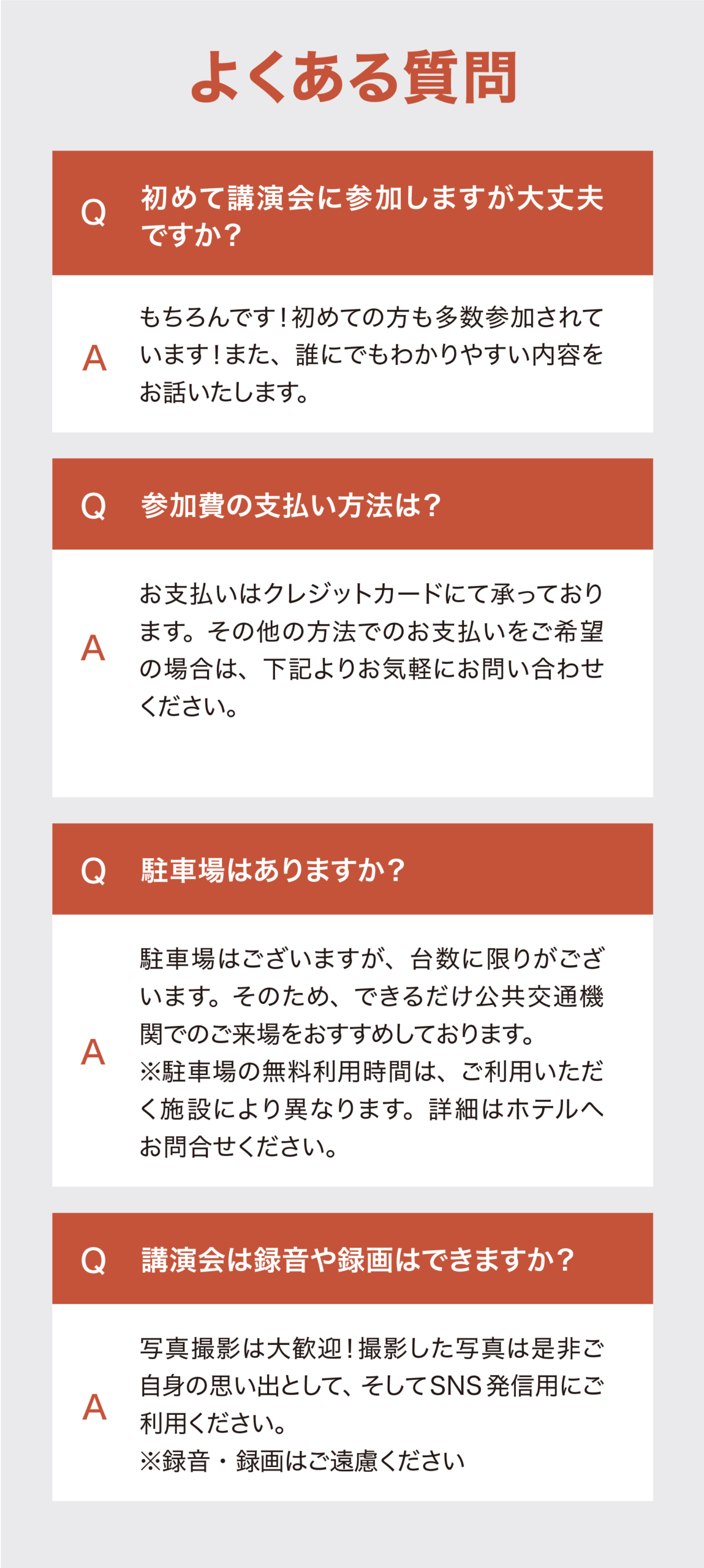 - 本講演会は、紙のチケットの発送はございません。受付にて、お申し込みの際のお名前をお伝えいただいてのご入場を予定しております。